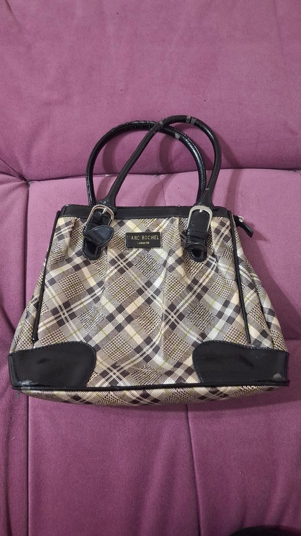 Kadın çantası, parlak kahverengi kareli desen ve tokalı saplara sahiptir. Siyah detaylarla sentetik kumaştan üretilmiş, günlük kullanıma uygun şık bir sokak stili çantadır.