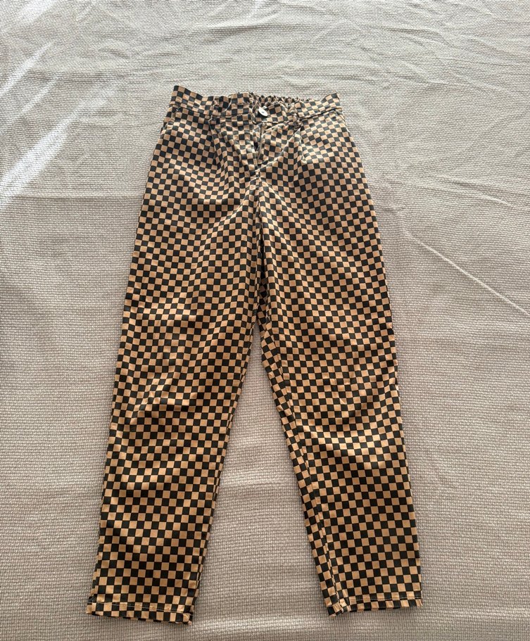 Kahverengi kareli kumaştan, normal boy ve regular fit kesime sahip, kemerli kadın pantolonu. Günlük sokak stili için uygun.