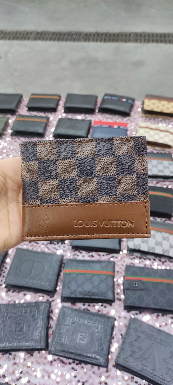 Koyu kahverengi kareli desene sahip, 'LOUIS VUITTON' kabartmalı deri detaylı erkek cüzdanı. Trendy ve rahat sokak stili için uygundur.