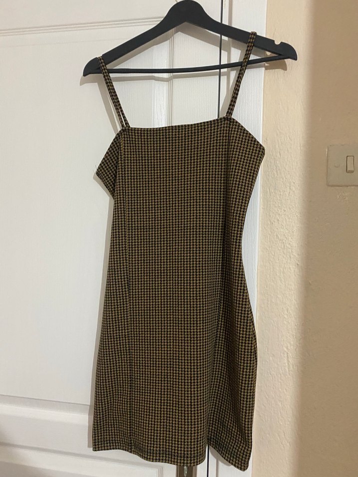 Kahverengi kareli, ince askılı ve tokalı detaylı bu elbise, Paris sokak modasından esinlenmiştir. Mini boyda, straplez yakalı ve sentetik kumaştandır.