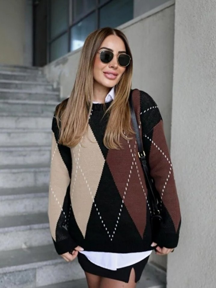 Kahverengi kareli, örgü kumaştan yapılmış, bol kesim kısa uzunlukta, uzun kollu ve yuvarlak yakalı kadın kazak. Günlük sokak stili için uygundur. standar t beden s,m,ve l beden uygundur