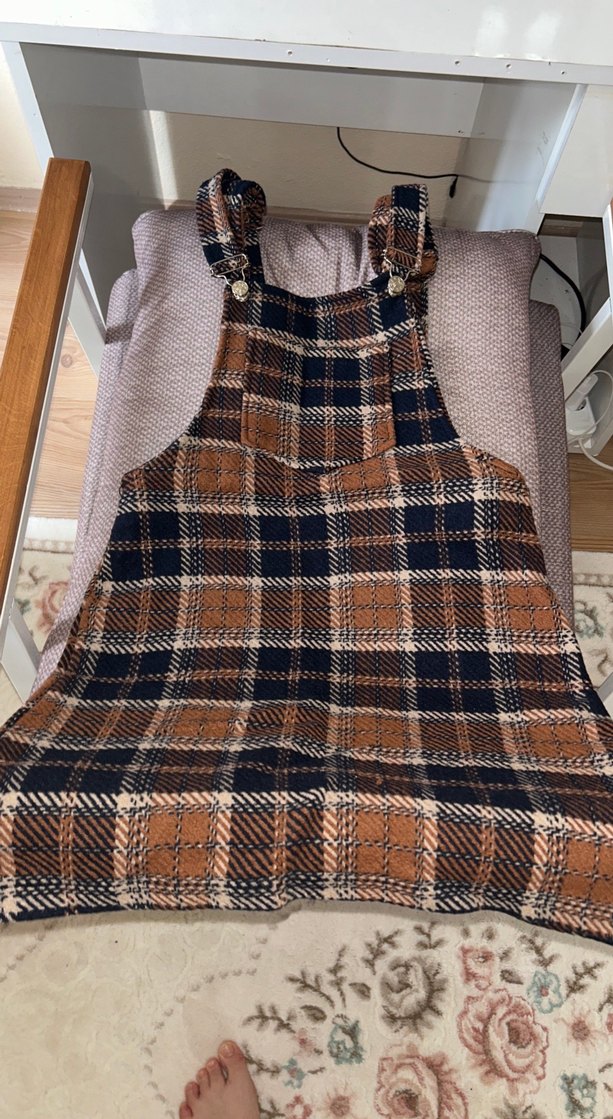 Kız tulumu, kahverengi kareli örme kumaştan, askılı ve bol kesimdir. Sokak stiline uygundur.