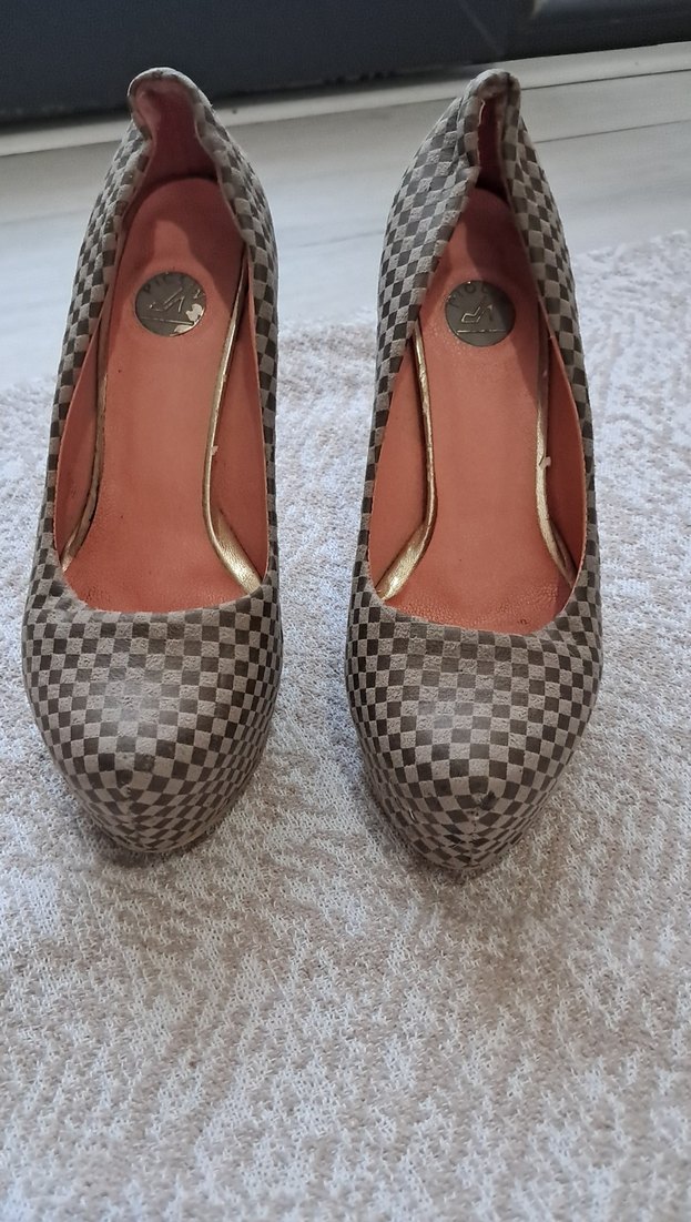 Kahverengi ve gri kareli desende, platform topuklu, tokalı kauçuk kadın babet. Günlük kullanım için modern klasik tarzda.