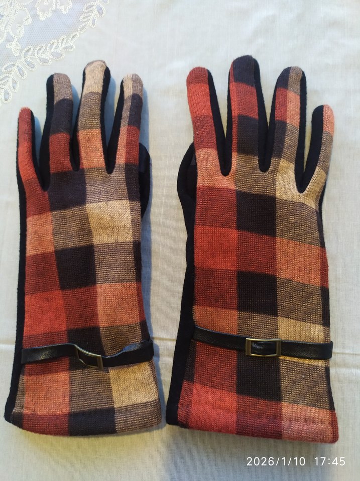 Kahverengi kareli, tokalı detaylı, yumuşak ve sıcak kumaştan yapılmış renkli, retro tarzda kadın eldivenleri.