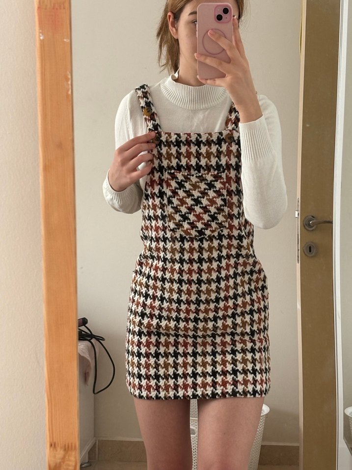 Kahverengi pastel tonlarda kareli triko mini elbise. hiç giyilmedi defosu yoktur