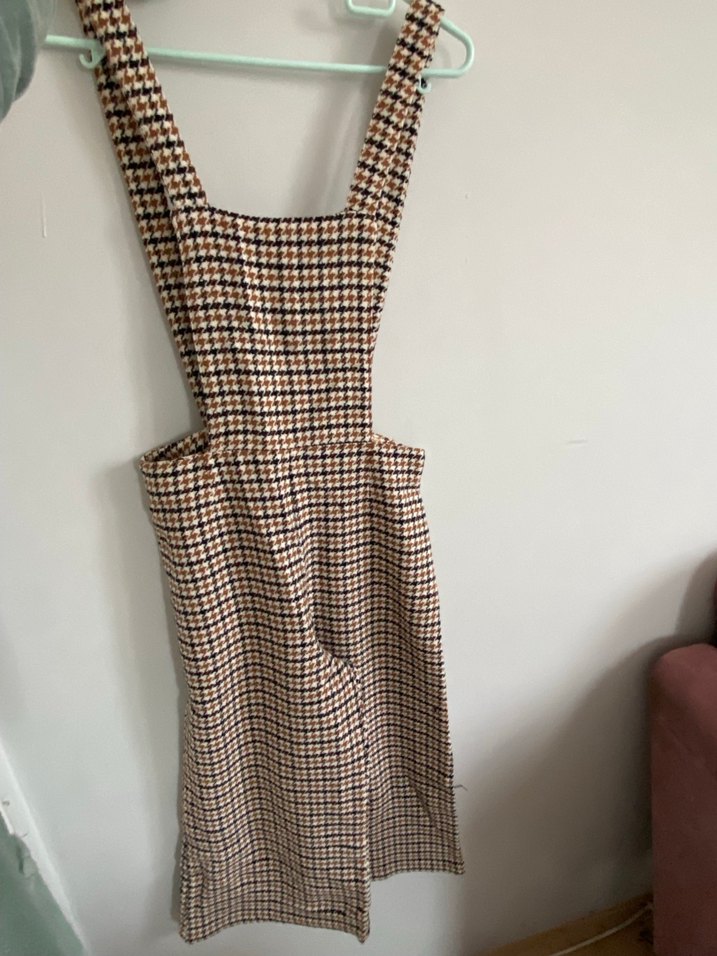 Koyu kahverengi kareli desenli, ön cepli kullanışlı tulum