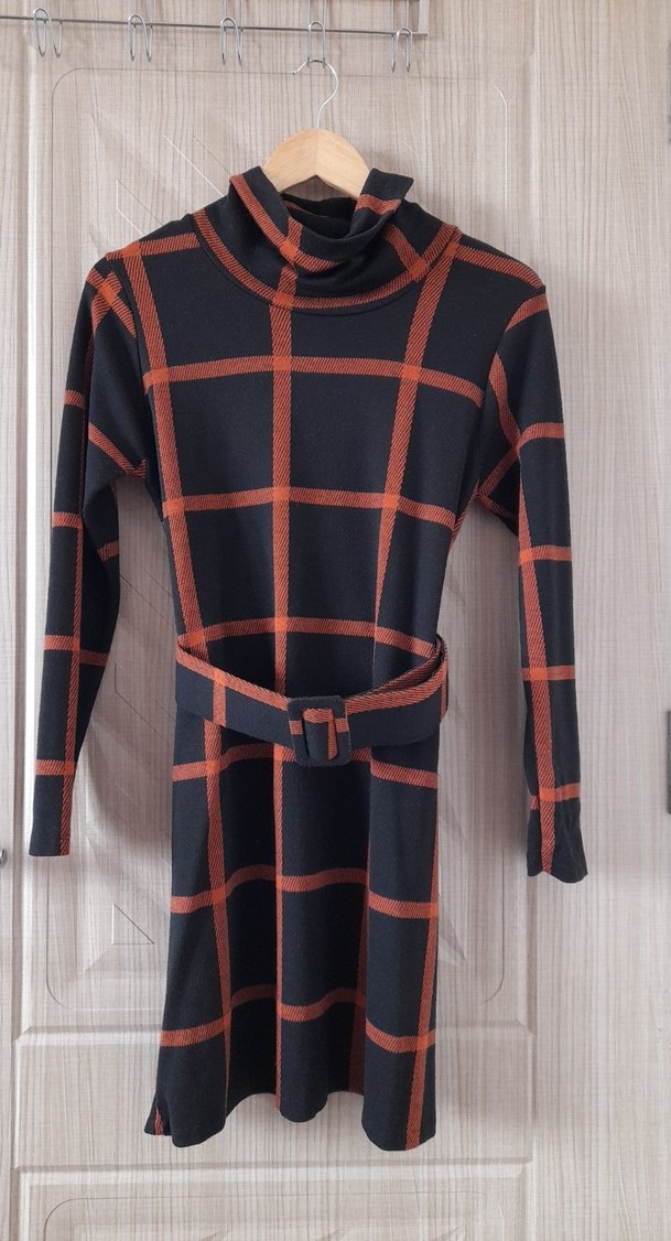 Kahverengi kareli uzun elbise, boğazlı yakalı ve uzun kolludur. Kemerli ve vücuda oturan kesimiyle rahat ve şık bir sokak stili sunar.