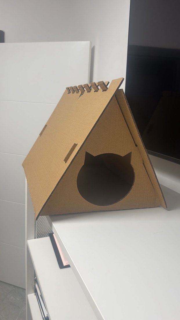 Kedi şeklinde girişli, koyu kahverengi kartondan yapılmış rahat bir kedi evi. İade yoktur.Toplu alımlarda indirim yapılır.Örnek görseldir aynısından gönderilecektir.