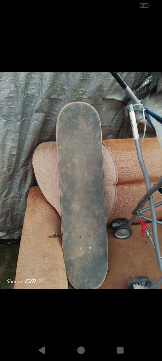 Kahverengi kaykay ve gri çocuk scooter'ı, kullanılmış görünümlü kaykay tahtası ve üç tekerlekli scooter içerir.
