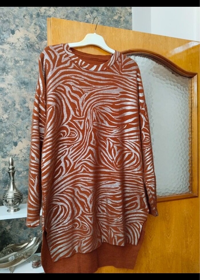 Ön tarafı simli iç tarafı normal kazak olduğu için asla kaşındırmaz bakır kahverengi