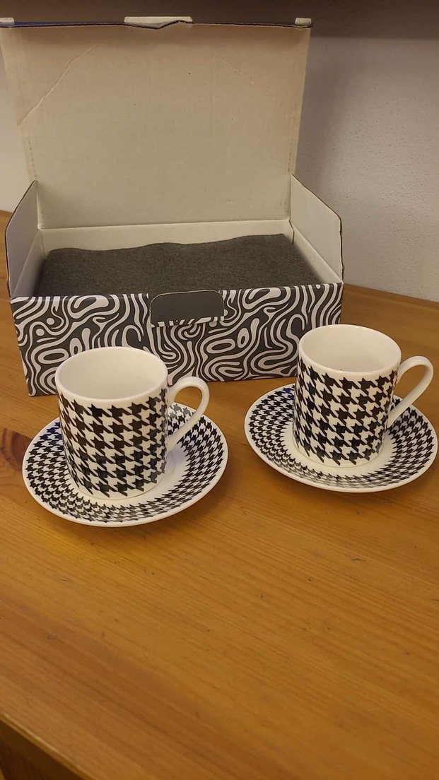 Kahverengi kazayağı desenli iki fincan ve tabak, şık bir kutu ile birlikte sunulmaktadır. ☕