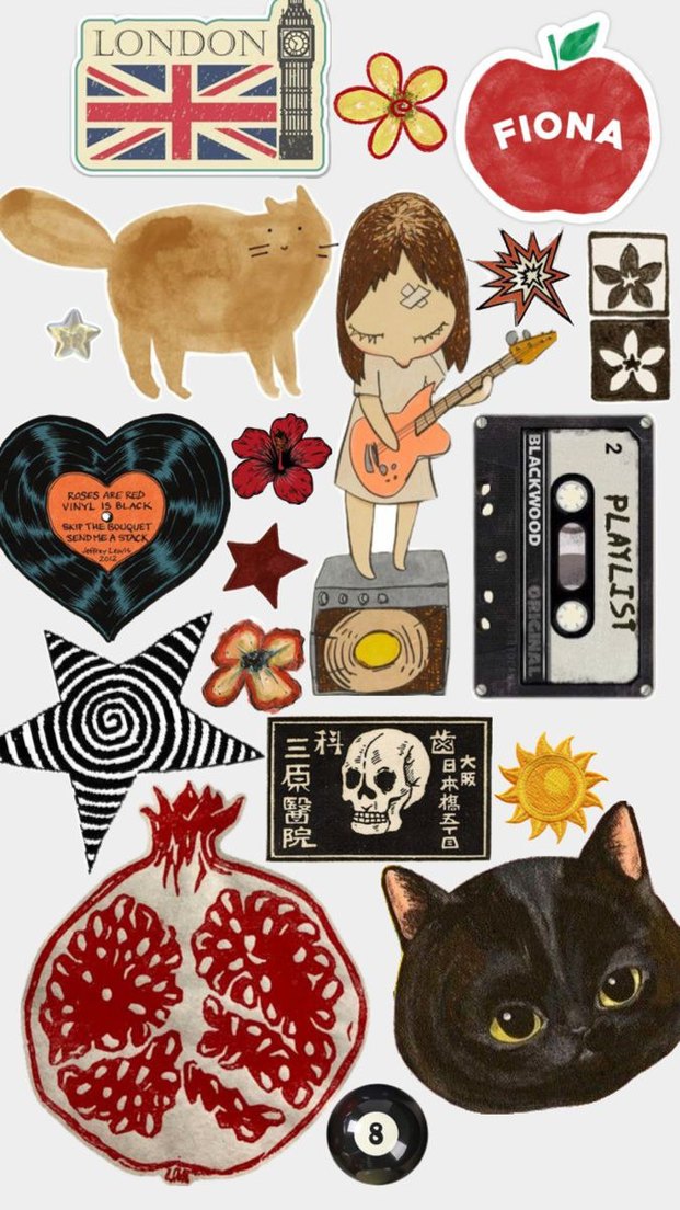 Kahverengi tonlarında kedi temalı çeşitli stickerlar içeren canlı bir aksesuar seti, kaset ve yıldız desenleriyle.