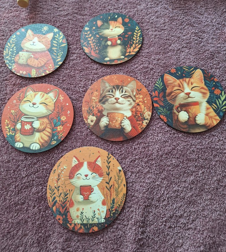 Kahverengi, kedi figürlü, çiçek detaylı yuvarlak altlıklar. Kedi severler için ideal.SATILDIMMMM