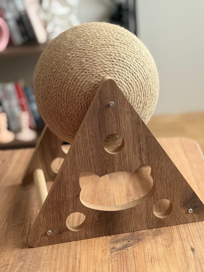 Örgü malzemeden yapılmış açık kahverengi top ve kesik detaylı üçgen ahşap stand içeren kedi aksesuarı.