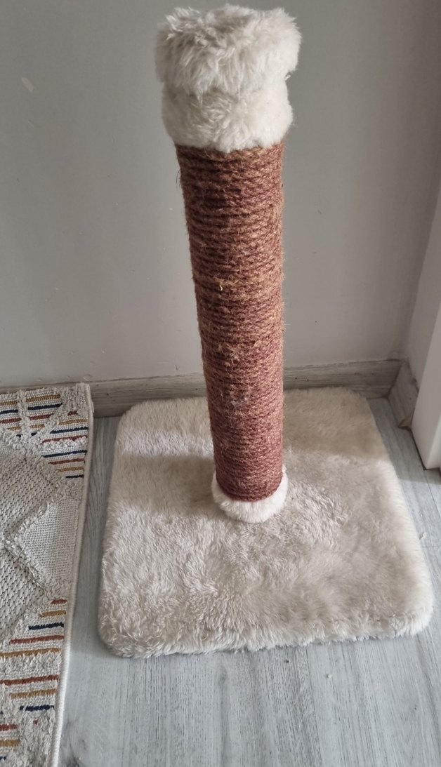 Kedi tırmalaması için yumuşak gri tabanlı kahverengi tırmalama tahtası.