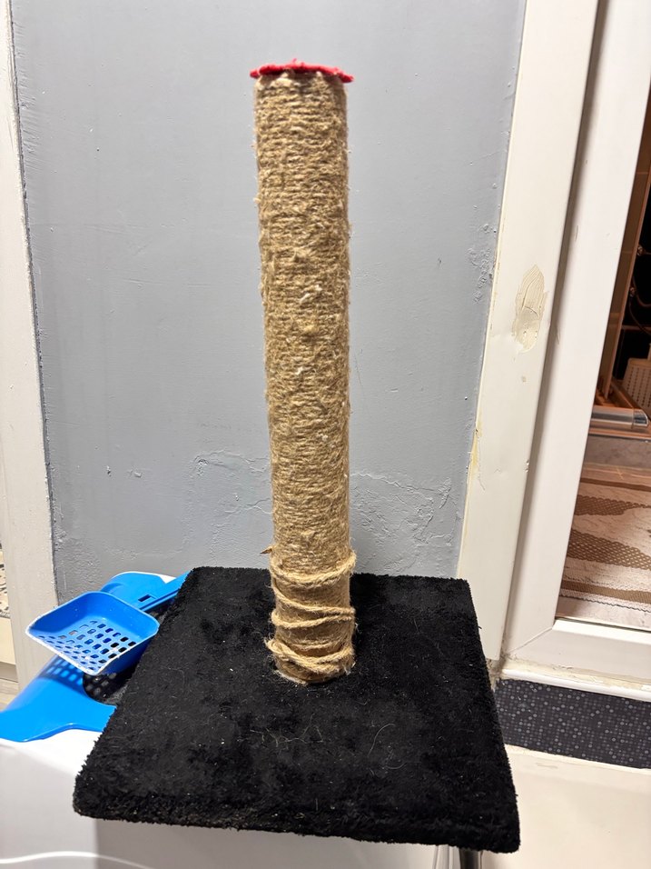 Kahverengi, yumuşak kumaş kaplı taban ve tırmalama için uygun yüksek dokulu direğe sahip kedi tırmalama tahtası.
