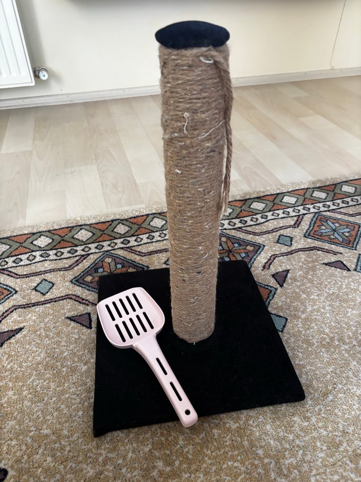 Kahverengi doğal ip sarılı kedi tırmalama tahtası, siyah taban ve gri kedi kumu küreği ile birlikte. Kedim tahtayı hiç kullanmadığı için kürekte fazla olduğu için satıyorum