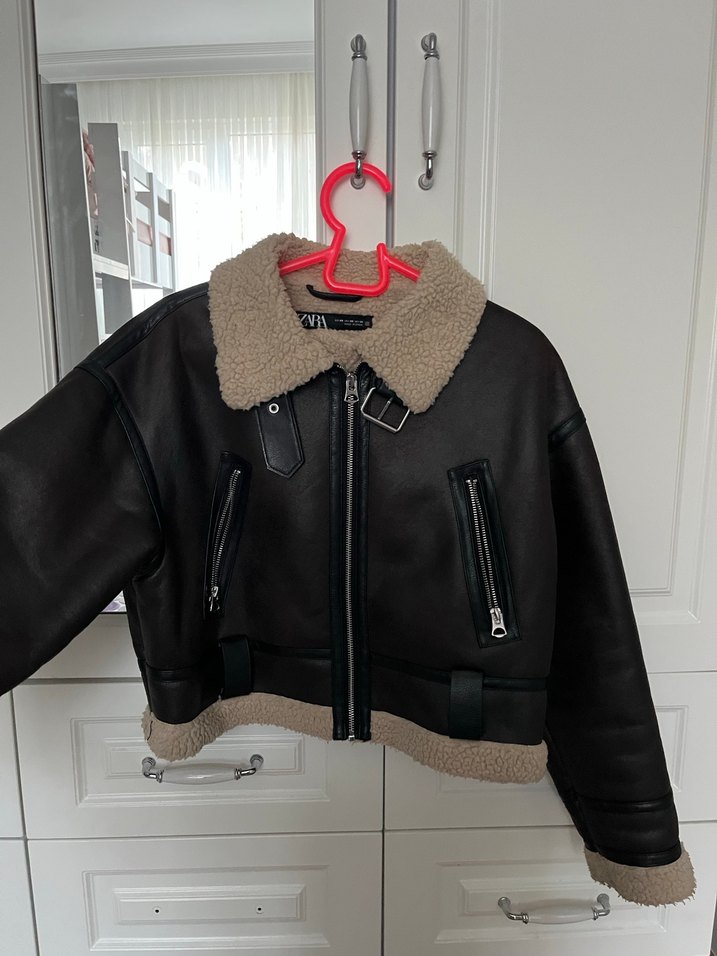 Kahverengi deri, kemerli, kısa kesim, yaka ve kol detayları olan, günlük sokak stili için uygun şık kadın ceketi.