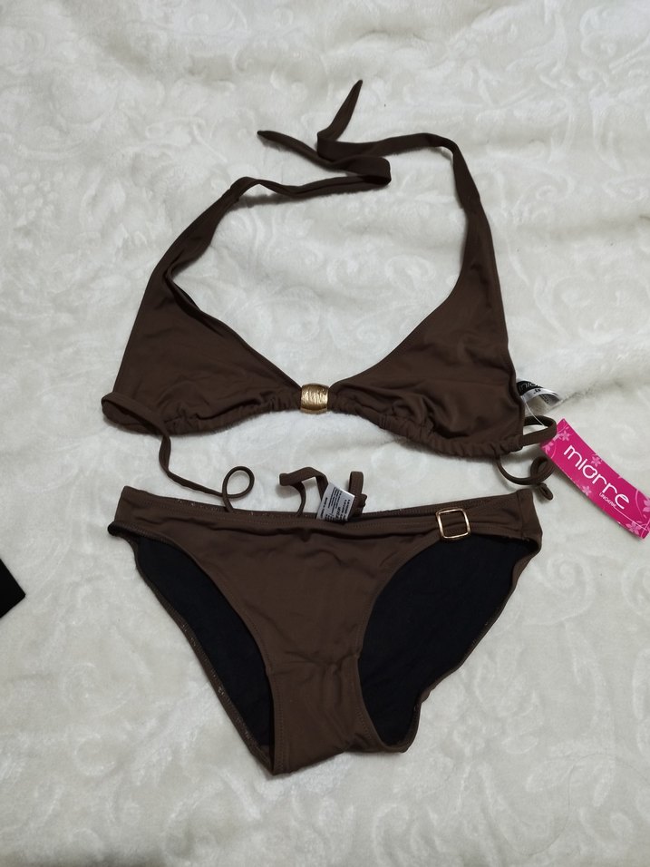 Kahverengi, kemerli ve askılı üst detaylı, kısa kesim bikini, minimalist plaj tarzına uygun.