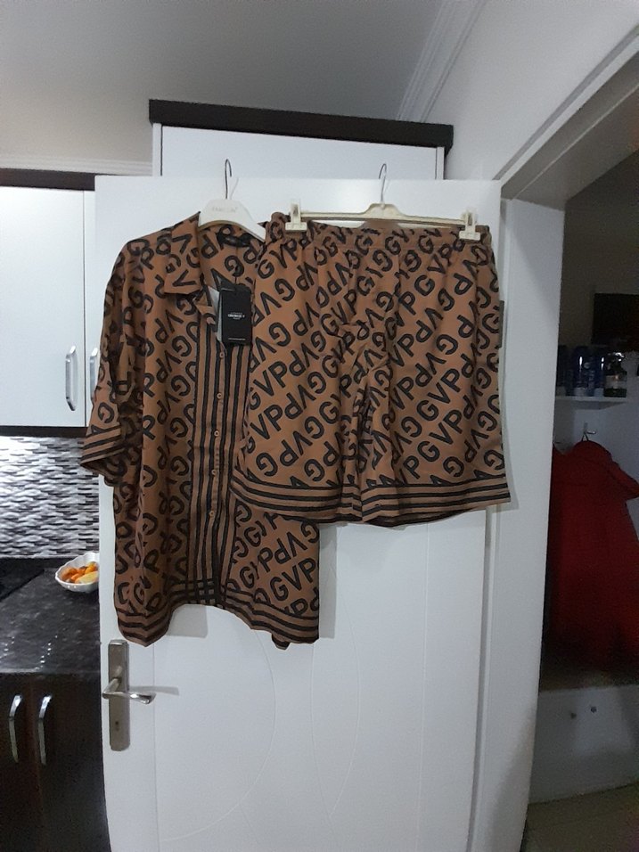 Kahverengli siyahlıi kısa kollu tişört, bol kesim ve yuvarlak yaka ile batik desenlidir. Kemer detaylı, rahat ve şık ikili takim ithal ürün