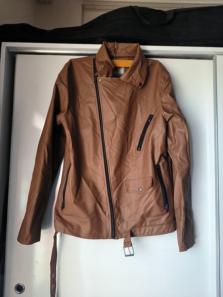 taba/ Camel kahve deri biker ceket, Normal kesim ve midi boyda, şık ve gündelik kullanım için uygun. hiç kullanilmadi