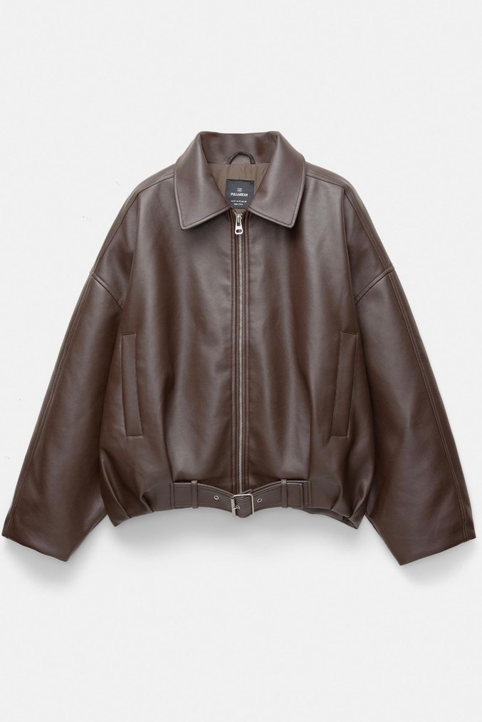 Kahverengi deri bomber ceket, alt kısmında kemere sahip. Oversize duruş, günlük rahat sokak stili için uygundur.