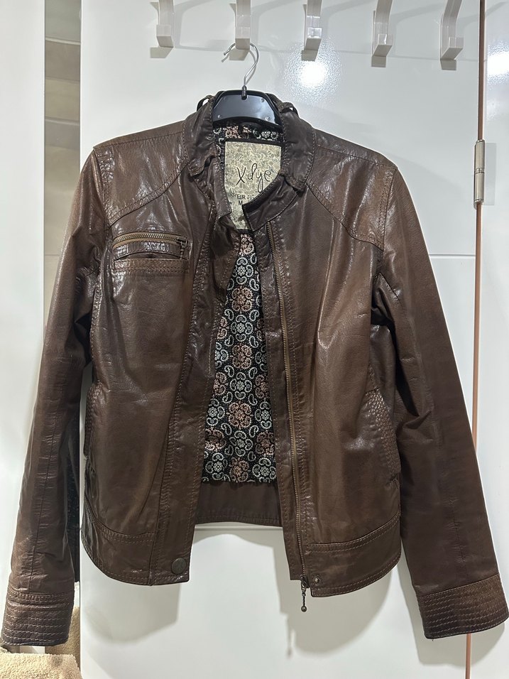 Kahverengi deri biker ceket, kemerli bel, uzun kollu ve normal kesimdir. desen içermeyen tasarımı günlük sokak stiline uygundur. Gerçek kuzu derisi.
