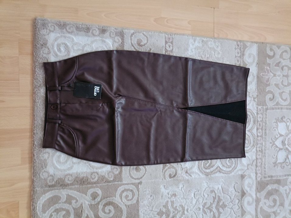 Koyu kahverengi, kemerli, deri kumaştan, midi boy, düz desensiz, sokak stiline uygun kadın etek önünde yırtmacı var