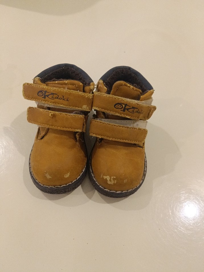 Kahverengi, parlak kauçuk malzemeden yapılmış, kemerli kayışlara sahip, sade tasarımlı erkek çocuk botu.