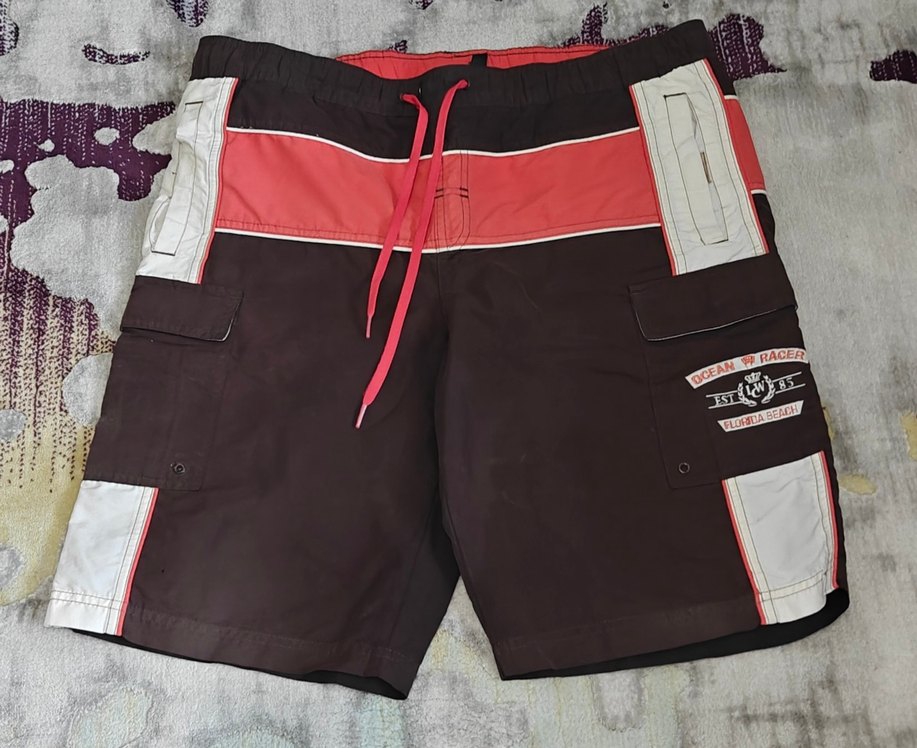 Kahverengi, kırmızı ve beyaz detaylı bel kemerli, fit kesim erkek mini şort, plaj için uygun sokak stili ile.
