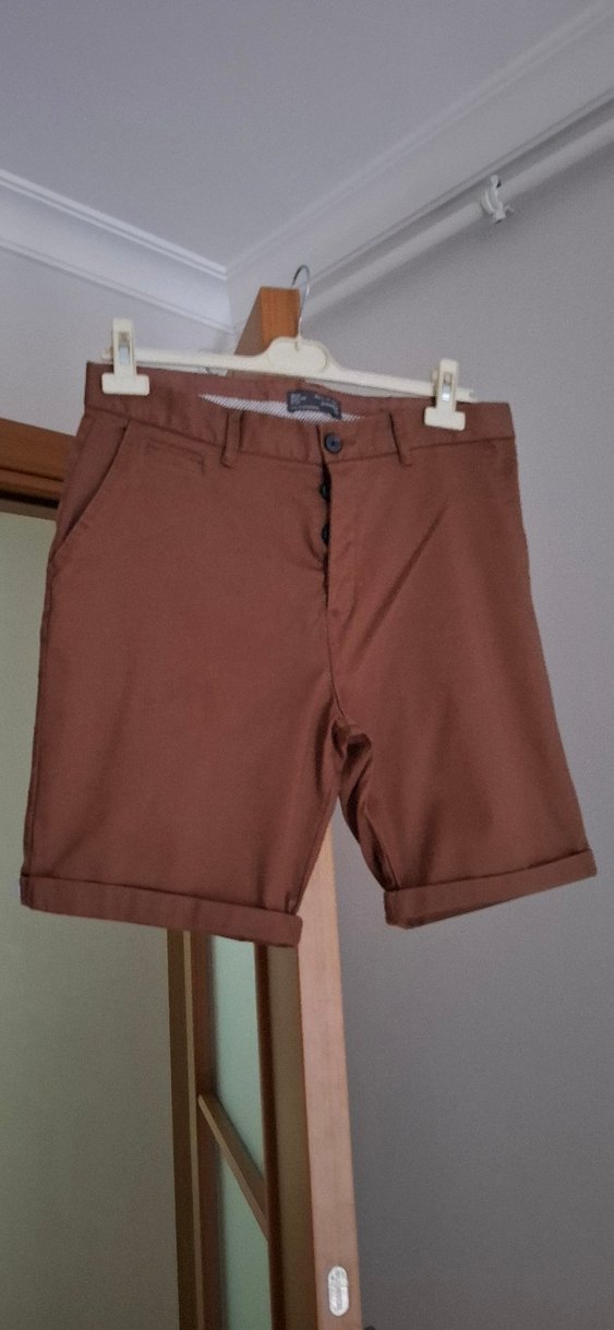 Kahverengi, kısa paçalı, kemerli ve rahat kesimli erkek şort. Yumuşak sentetik kumaştan üretilmiş, günlük ve sokak tarzına uygun.