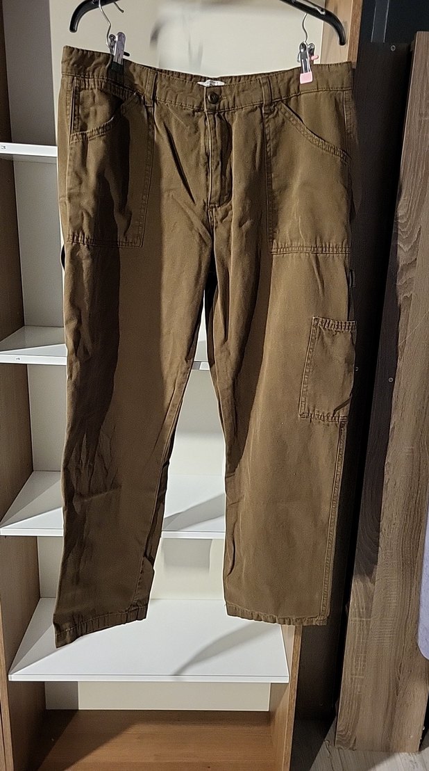 Kahverengi, kemerli ve bol kesim Erkek pantolon. Normal midi boyda, desen içermeyen, günlük kullanıma uygun rahat bir model.