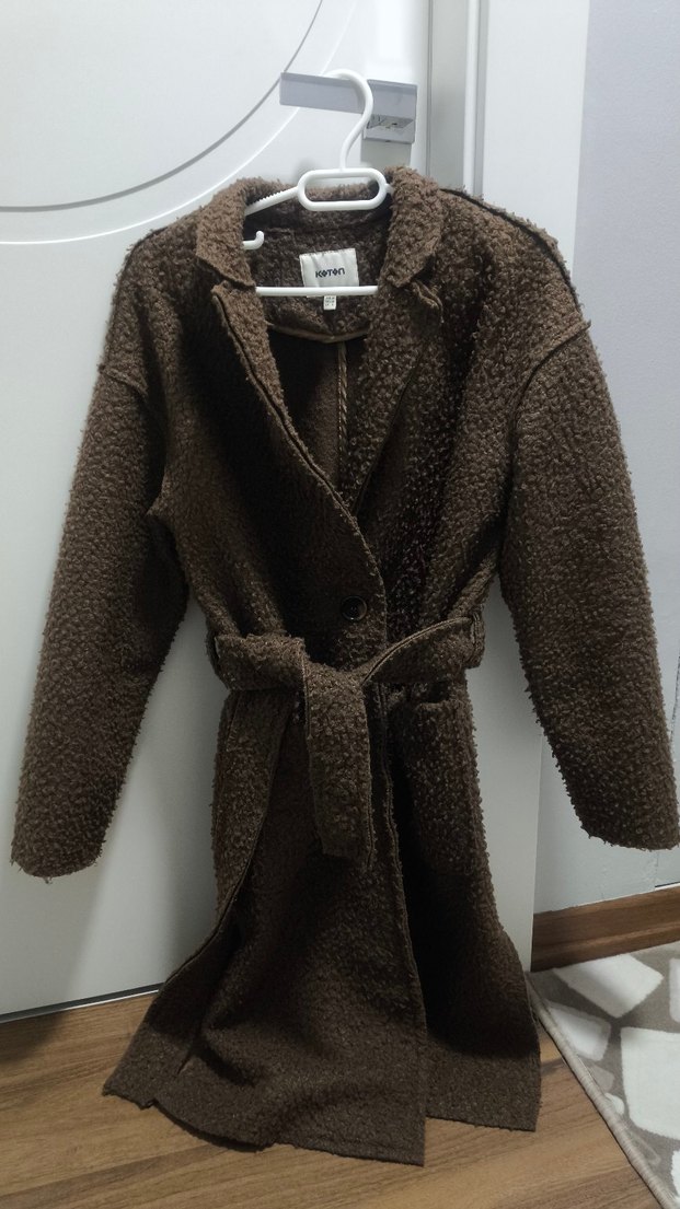 Yumuşak dokulu kahverengi kaban, düğmeli ve kemerli. Uzun kollu, rahat kesim ve yakalı.