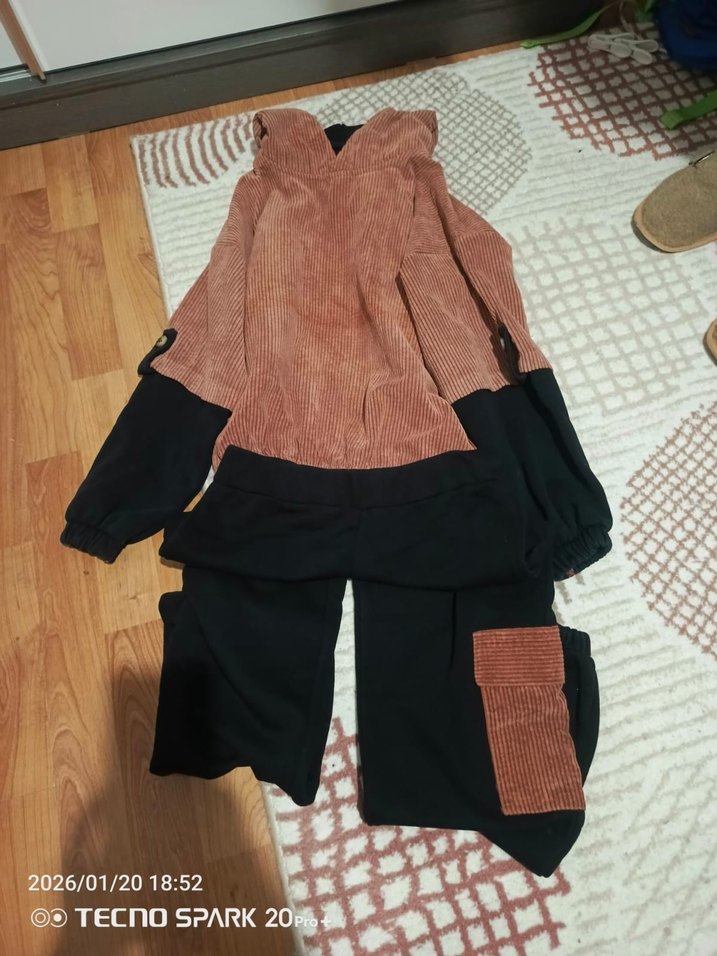 Kahverengi kadife kumaştan, kemerli ve bol kesim kız eşofmanı. Yüksek yakalı ve uzun kolludur, yumuşak ve rahat kumaştan yapılmıştır.