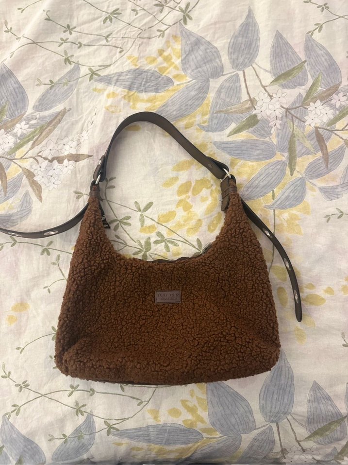 Kahverengi kadın çanta, yumuşak ve sıcak fleece kumaştan yapılmıştır. Kemerli askısı, rahat ve trend sokak stiline uygundur. Günlük kullanım için ideal, pastel renkli baskılı desene sahiptir.