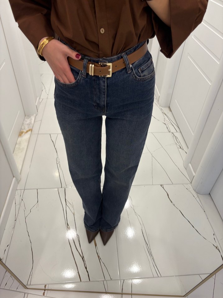 Kahverengi, kemerli, normal boy ve regular fit kadın denim pantolon. Günlük rahat kullanıma uygundur.