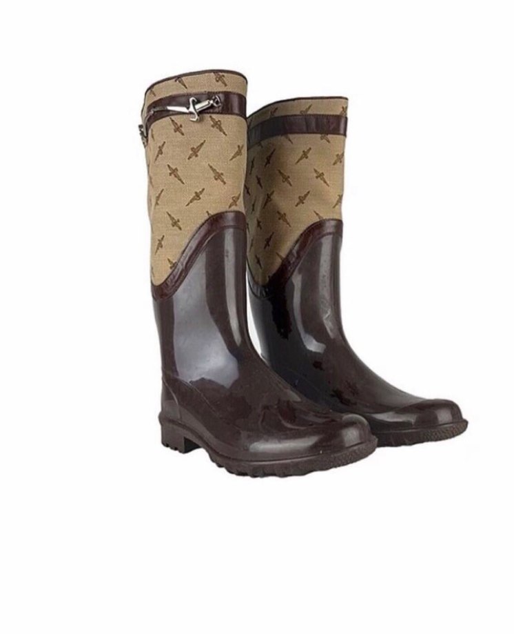 Kahverengi kemerli, yüksek topuklu kadın dizüstü botları. Kauçuk malzemeden yapılmış, bohem tarzı ve günlük rahatlığı sunar.