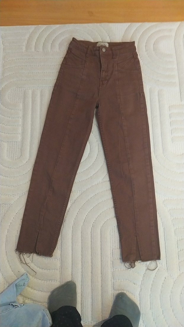 Bu kahverengi kot pantolon, normal boy ve regular fit özelliklerindedir. Kemerli ve midi uzunlukta, günlük kullanım için uygundur. Trendy casual tarzda sokak modasına uygun.