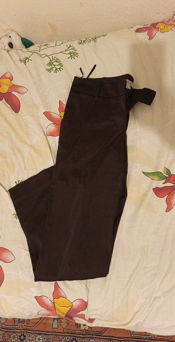 Kahverengi kemerli, midi boy, dar kesim kumaş pantolon. Sentetik kumaştan, günlük ve iş stiline uygun rahat bir seçenektir. parlak sahte cepli