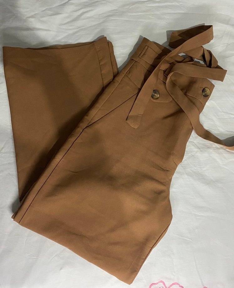 Kahverengi kumaştan, kemerli, normal boy pantolon. Parlak yüzeyi ve desensiz yapısıyla trend sokak modasına uygun.