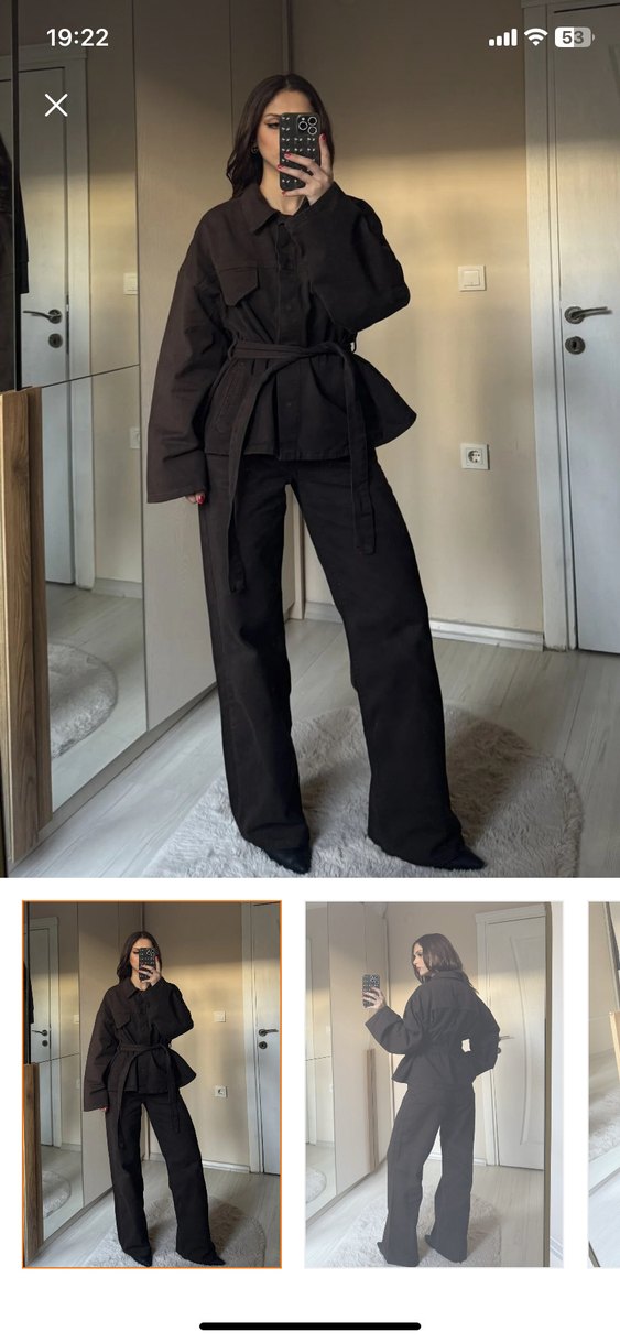 Kahverengi, kemerli, regular fit kadın ofis takımı. Notch yakalı ve askılı kollu, sentetik kumaştan üretilmiştir. Şık ve rahat bir görünüm sağlar.