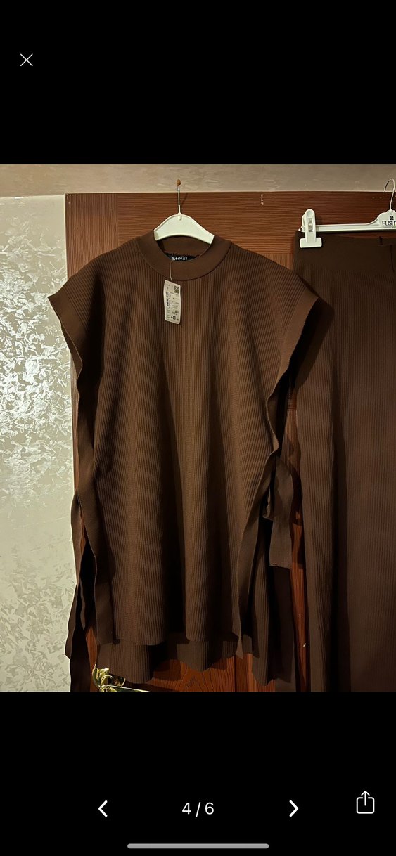 Kahverengi, kolsuz, bol kesim ve kemerli uzun süveter. Yuvarlak yaka, koyu renk ve rahat sokak stili. Günlük kullanıma uygun triko ürün kullanılmıştır 2 kere etiketli değildir..