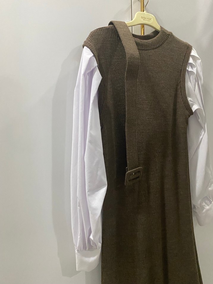 Kahverengi, kolsuz, bisiklet yaka, kemerli, uzun ve regular fit kadın triko elbise, günlük kullanıma uygun. 36-42 beden arası olur sadece bir kaç kez giyildi