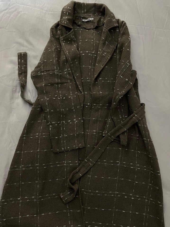 Kahverengi, kemerli, uzun kadın kabanı, sentetik kumaştan ve notched yakalıdır. Düzenli kesim ve rahat sokak stili sunar. Askılı kolları ile dikkat çeker.