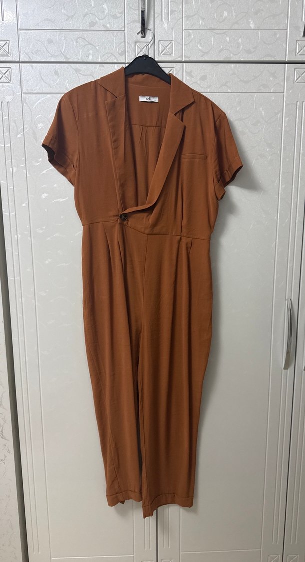 Kahverengi uzun tulum, kısa kollu ve yaka detaylıdır. Kemerli bel ve rahat kesim, yumuşak keten kumaştır üretilmiştir. Ofis ve günlük kullanıma uygundur. Fiyata indirim vardır bir gece kınada giyildi kilo verildiği için büyük geliyor