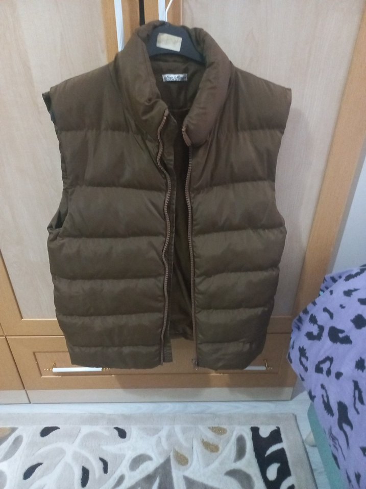 Kahverengi, kemerli, yüksek yakalı ve fitted kesim kadın şişme yelek. Yumuşak ve sıcak kumaştan, günlük rahat sokak stili için midi boyda.boyu 72 eni 53cm.