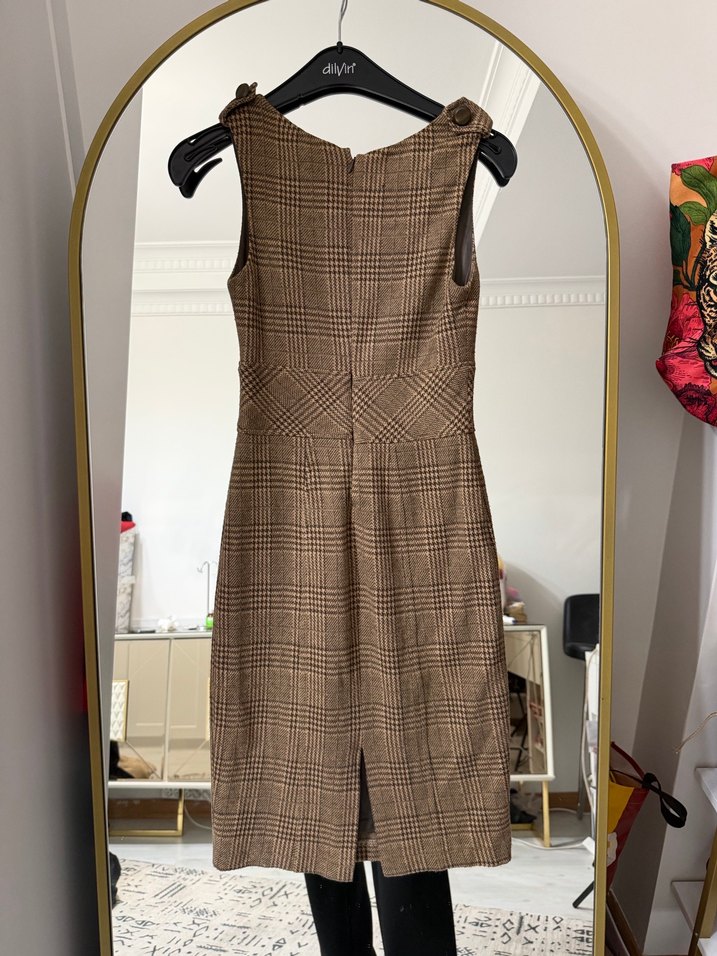 Kahverengi Kemerli Kareli Midi Elbise