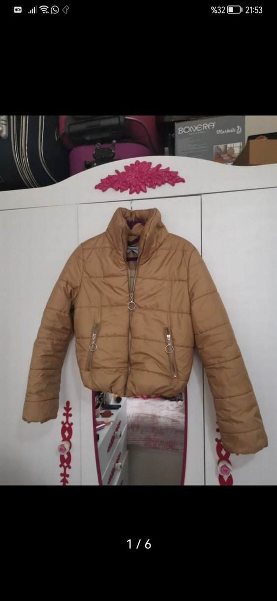 Hafif kahverengi, kemerli ve beli oturan bu kışlık mont, yüksek yakalı ve askılı kolludur. Sentetik kumaşı sıcaklık sağlar, günlük kullanıma uygundur.