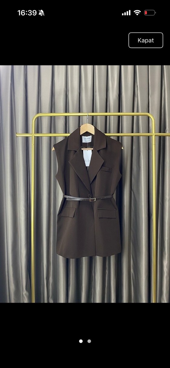 Kahverengi, kolsuz, kemerli mini yelek. Klasik yakalı, kısa boylu ve regular fit. Ofis ve günlük kullanıma uygun.