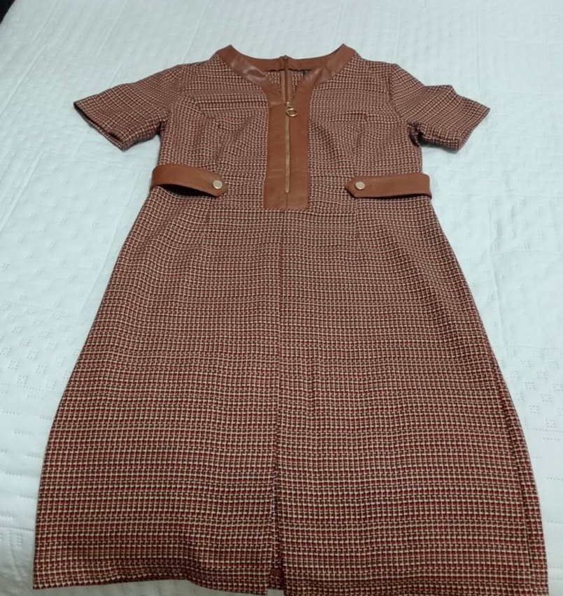 Kahverengi midi elbise, kısa kolluyakalı ve kemerli. Ofis için uygun,kumaştan, rahat kesim ve çağdaş tarzda.